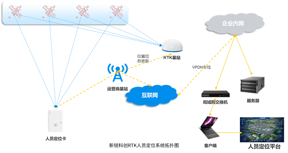 上圖是新銳科創自主研發的GPS/北斗RTK差分人員定位系統,系統主要由衛星、人員定位識別卡、RTK差分基站、服務器構成。RTK差分基站接收衛星信號,解算出差分信息后通過4G網絡上報給服務器(企業內網部署),服務器實時刷新最新的差分信息;人員定位識別卡接收衛星信號,通過4G網絡連接服務器,獲取最新的差分信息,從而解算出高精度經緯度位置信息后,再通過4G網絡將位置信息上傳到服務器,更新卡片位置信息。