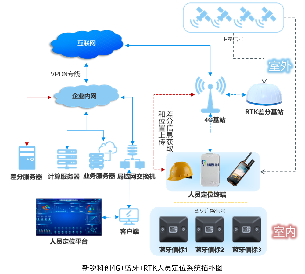 室外部分:RTK差分基站接收衛星信號,解算出差分信息后通過4G網絡上報給差分服務器,差分服務器實時刷新最新的差分信息;定位終端(卡片/安全帽/手持終端)接收衛星信號,通過4G連接差分服務器,獲取最新的差分信息,從而解算出高精度經緯度位置信息后,再通過4G網絡將位置信息上傳到計算服務器,更新卡片位置信息。