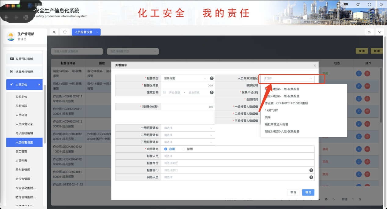 系統支持在廠區自定義設置電子圍欄范圍,設定圍欄生效時間、限定人數,通過設定區域的進入權限管理規則,系統能夠確保人員只在安全范圍內活動,有效防止了違規進入危險區域的行為。