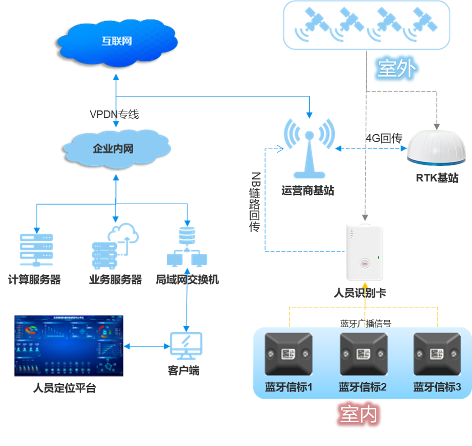 室外部分:RTK基站接收衛星信號,解算出差分信息,通過4G網絡上傳給服務器;定位卡通過接收衛星信號解算出經緯度位置信息及其它原始觀測量,通過NB-IoT窄帶物聯網將數據上傳到服務器;服務器接收定位卡的原始觀測量+RTK基站的差分信息并解算出定位卡的高精度位置,與地圖引擎進行信息處理后,在展示終端展現人員位置。
